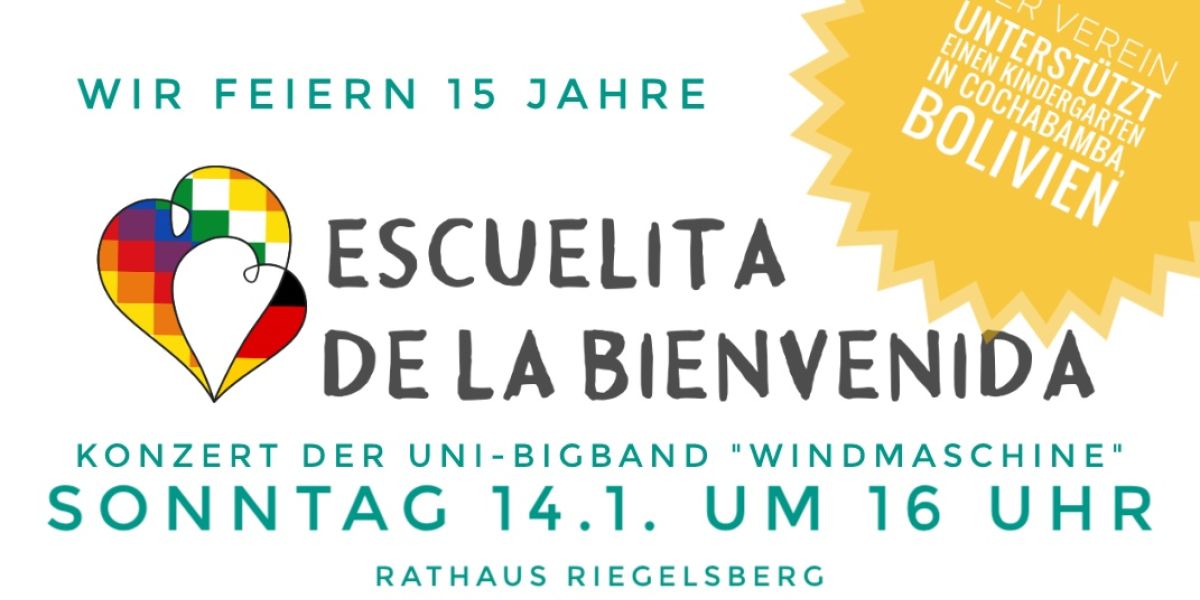 am Sonntag, 14.1.2024 um 16 Uhr findet aus Anlass des 15 jährigen Bestehens unseres Vereins "Escuelita de la Bienvenida Cochabamba e.V." im Rathaus Riegelsberg ein Konzert mit der Bigband der Universität des Saarlandes Windmaschine unter Leitung von Cordula Hamacher statt.