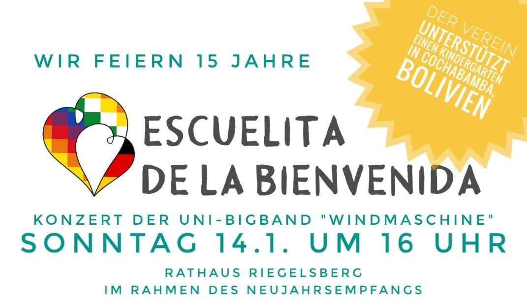 Liebe Freundinnen und Freunde, am Sonntag, 14.1.2024 um 16 Uhr findet aus Anlass des 15 jährigen Bestehens unseres Vereins "Escuelita de la Bienvenida Cochabamba e.V." im Rathaus Riegelsberg ein Konzert mit der Bigband der Universität des Saarlandes Windmaschine unter Leitung von Cordula Hamacher statt.
